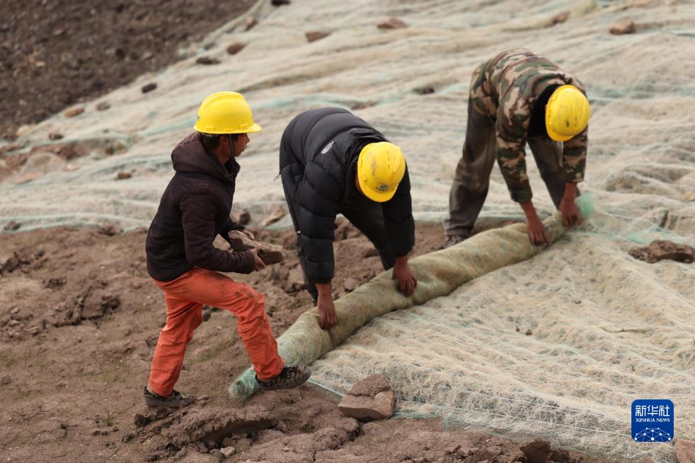 在若爾蓋縣達扎寺鎮多瑪村廢棄礦山治理點(diǎn),工人在邊坡上鋪椰絲毯(8月23日攝)。