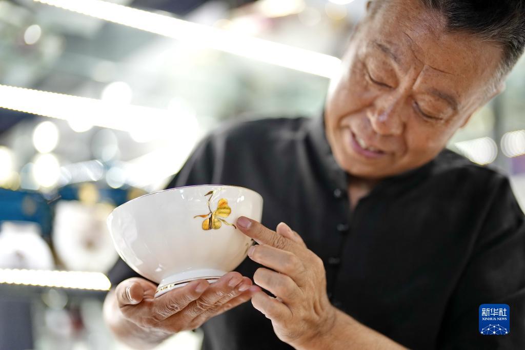 河北省唐山市素有“北方瓷都”的美譽(yù),陶瓷雕金技藝作為陶瓷裝飾技法之一,在當地歷史悠久。唐山市路北區居民戴佩維17歲時(shí)進(jìn)入陶瓷廠(chǎng)學(xué)習雕金技藝,經(jīng)過(guò)45年的潛心研究,將傳統技藝與美術(shù)繪畫(huà)、印刷技術(shù)、現代裝飾風(fēng)格相結合,在普通細白瓷、骨質(zhì)瓷等眾多瓷種上實(shí)現雕金裝飾的藝術(shù)創(chuàng )作,使雕金技法更加豐富多彩。2022年,以戴佩維為代表性傳承人的傳統陶瓷雕金技藝被列入唐山市市級非物質(zhì)文化遺產(chǎn)代表性項目名錄。