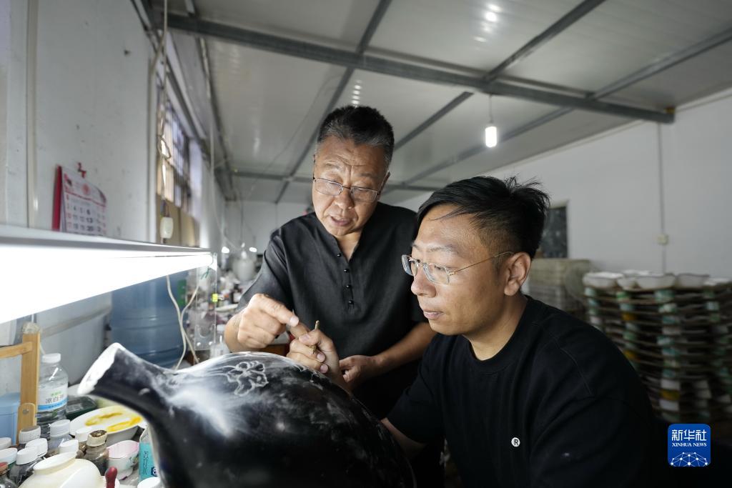 9月12日,戴佩維(左)在指導兒子戴博霖陶瓷雕金技巧。