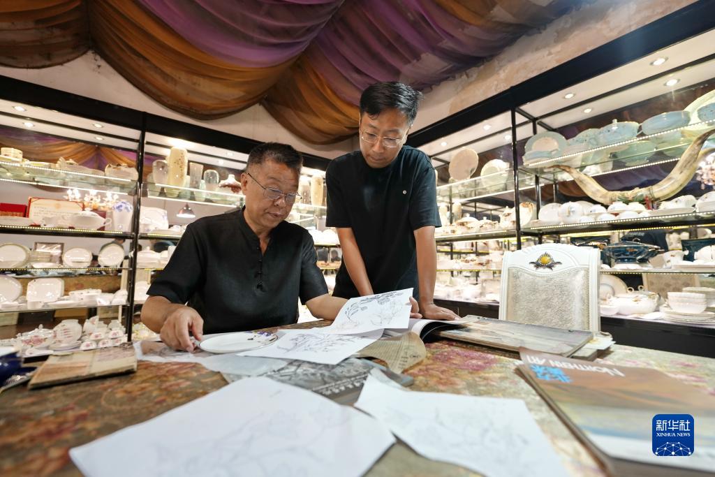 9月12日,戴佩維(左)和兒子戴博霖在研究陶瓷雕金產(chǎn)品制作所用圖紙。
