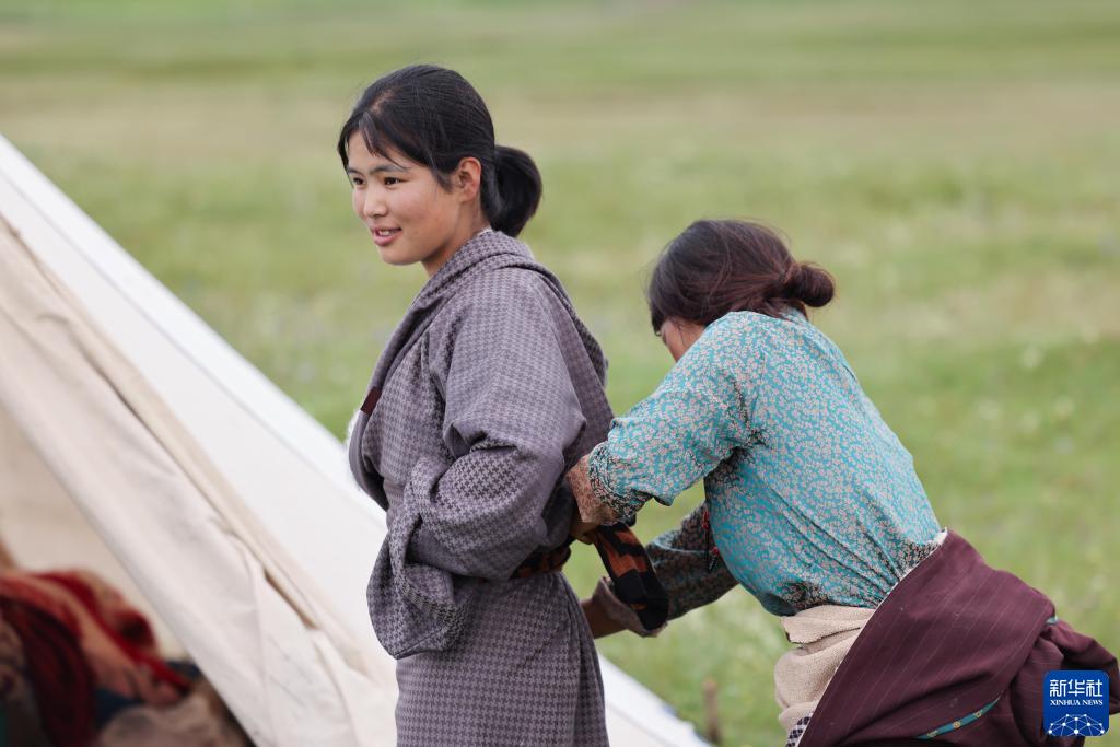 8月17日,在青海省黃南藏族自治州河南蒙古族自治縣多松鄉多松村,扎西曲培的妻子斗格吉(右)在為女兒仁青卓瑪整理衣裝。新華社記者 邢廣利 攝