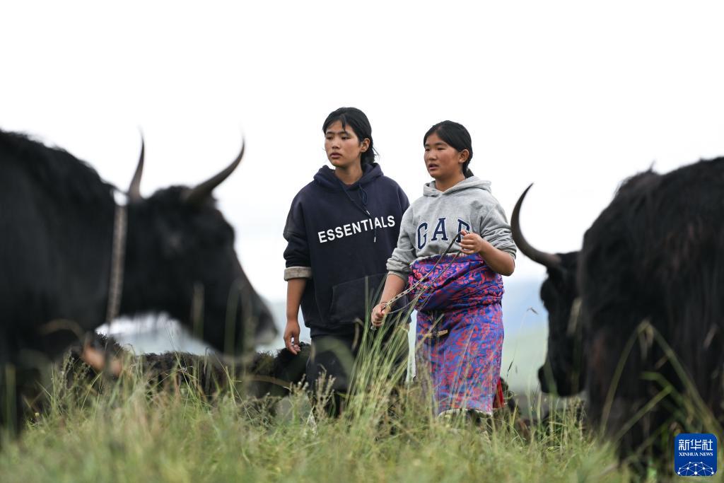 8月17日,在青海省黃南藏族自治州河南蒙古族自治縣多松鄉多松村,扎西曲培的女兒仁青卓瑪(左)與表妹準備擠牛奶。新華社記者 張龍 攝