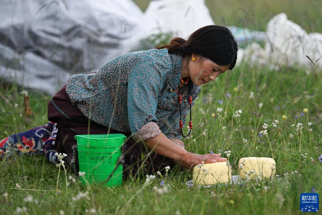 8月17日,在青海省黃南藏族自治州河南蒙古族自治縣多松鄉多松村,扎西曲培的妻子斗格吉在制作酥油。新華社記者 張龍 攝