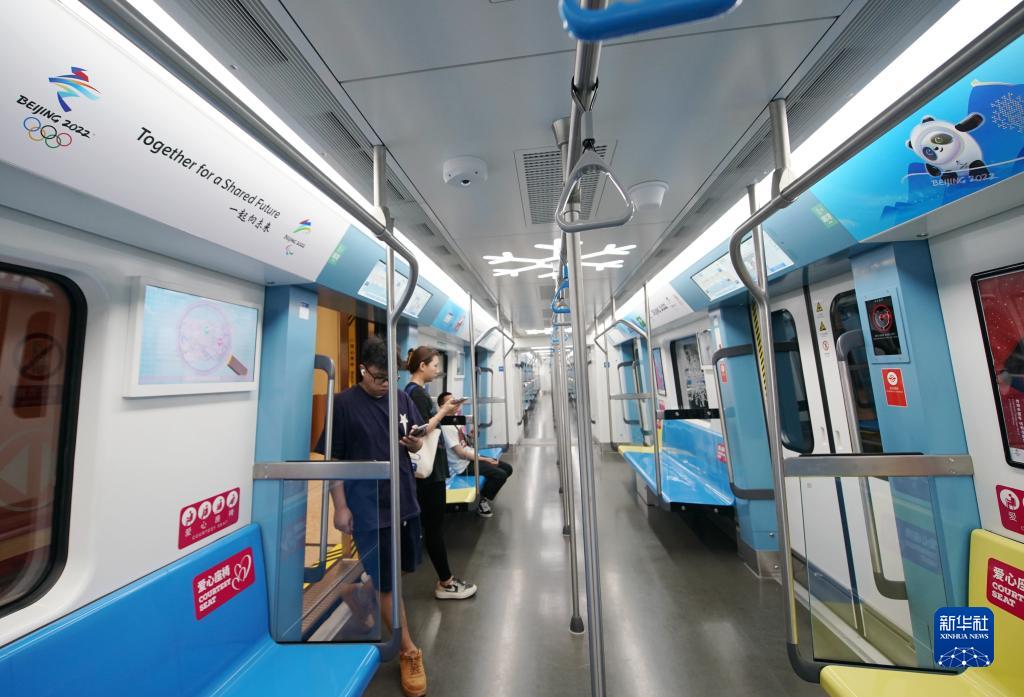 9月13日,乘客乘坐有冬奧元素裝飾的北京地鐵11號線(xiàn)(冬奧支線(xiàn))出行。