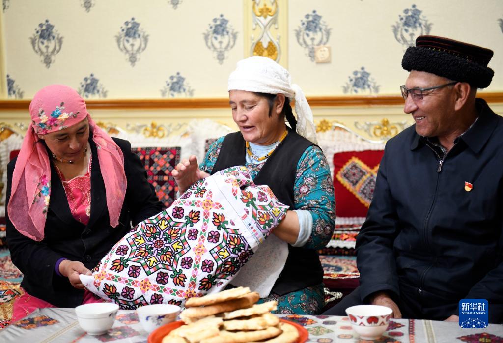 9月4日,巴依卡老人在家中休息,他的老伴帕熱扎·加依克(中)在繡制靠墊套。新華社記者 王菲 攝