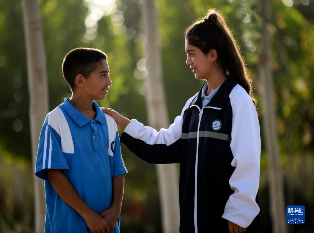 9月7日,在新疆喀什第二中學(xué)院內,拉齊尼的女兒都爾汗·拉齊尼和她的弟弟拉迪爾·拉齊尼聊天,姐姐鼓勵弟弟要好好學(xué)習。新華社記者 王菲 攝