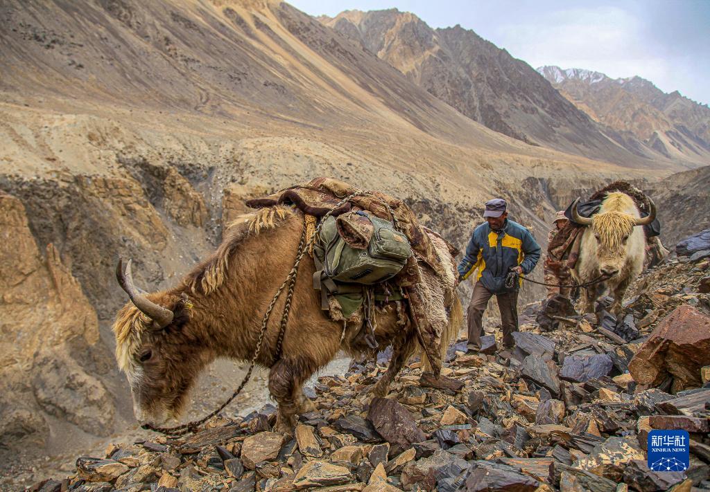 2013年9月28日,拉齊尼牽著(zhù)牦牛在陡峭的邊境線(xiàn)上巡邏。新華社發(fā)(王烈 攝)