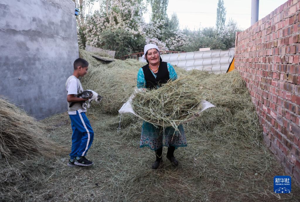 9月5日,巴依卡老人的老伴帕熱扎·加依克在為奶牛準備飼料,他們的小兒子熱飛·巴依卡在和貓玩耍。新華社記者 蘭紅光 攝