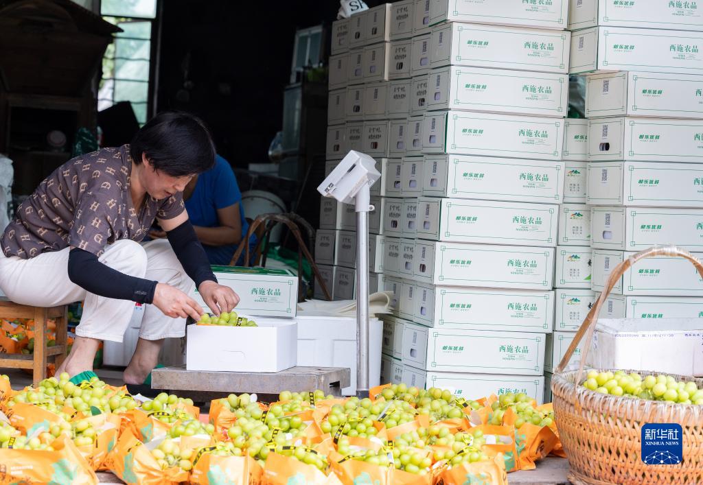 9月13日,浙江省諸暨市安華鎮五指山村的果農在給葡萄稱(chēng)重、包裝。