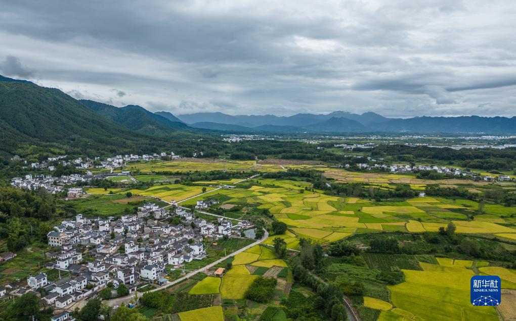 這是9月13日拍攝的黟縣碧陽(yáng)鎮附近的水稻田和徽派民居(無(wú)人機照片)。