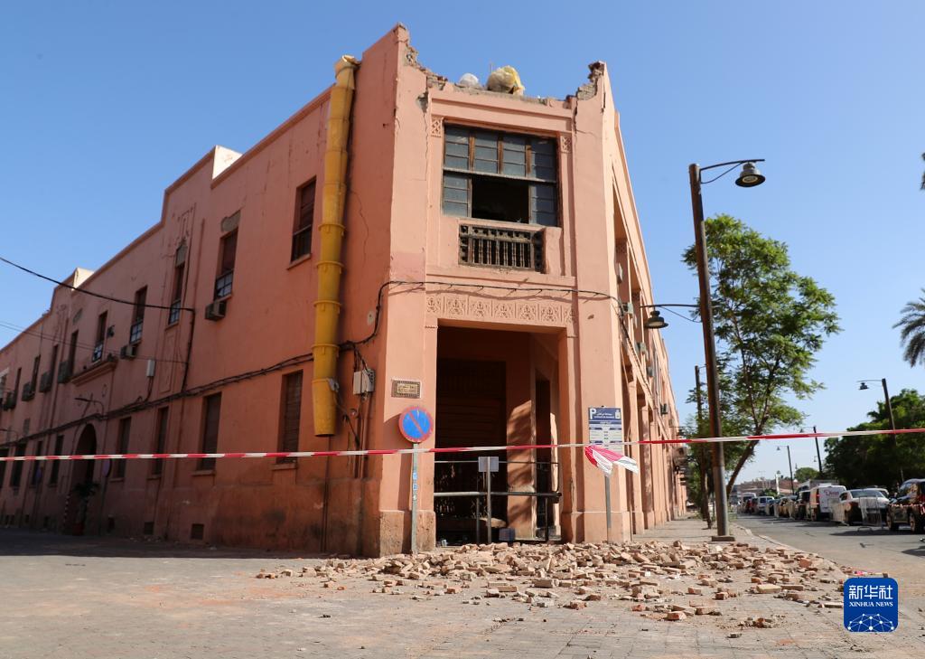這是9月13日在摩洛哥馬拉喀什老城拍攝的一處震后受損建筑。