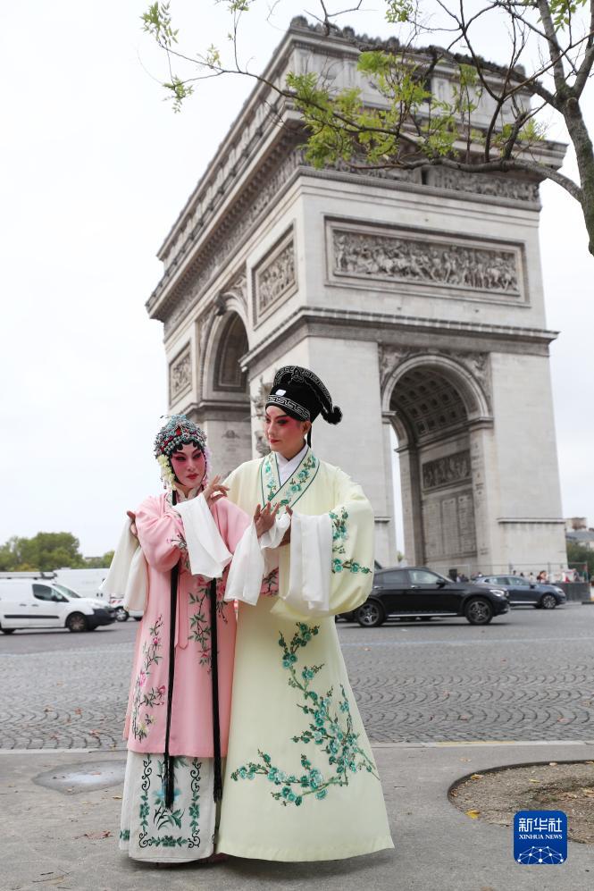 9月13日,江蘇省演藝集團昆劇院院長(cháng)施夏明(右)和江蘇省演藝集團昆劇院國家一級演員孔愛(ài)萍在法國巴黎凱旋門(mén)附近參加昆曲快閃。