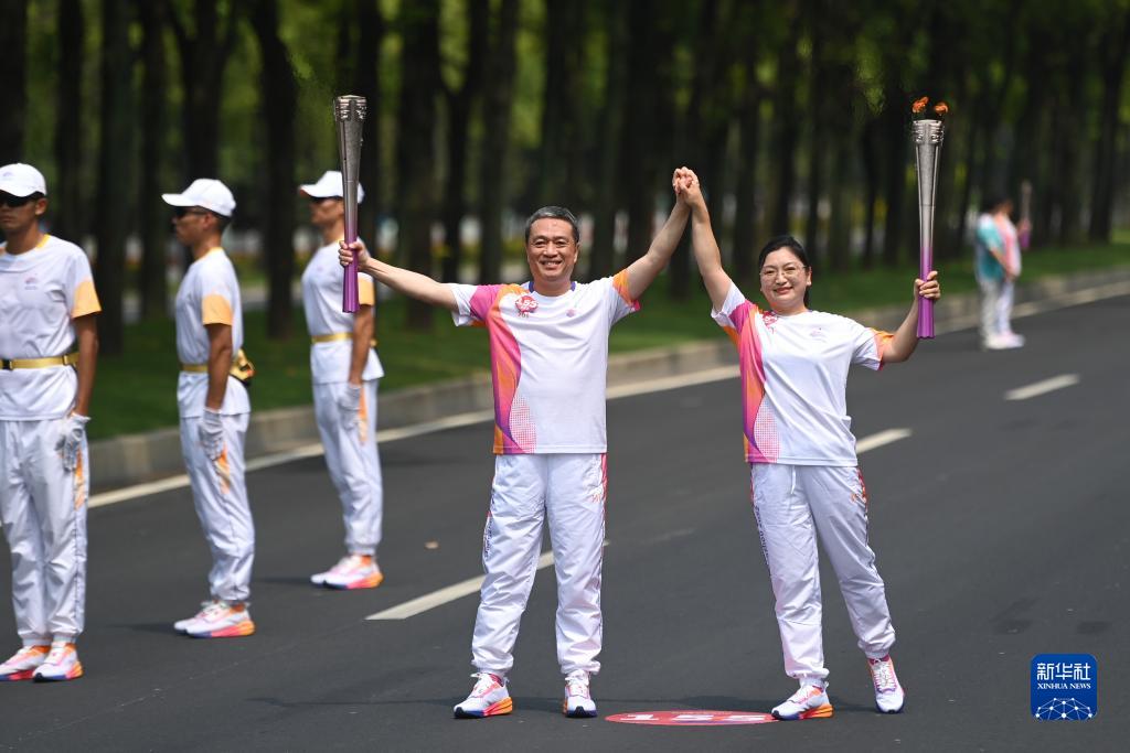 9月14日,火炬手傅群(左)與周秀利在火炬傳遞中。