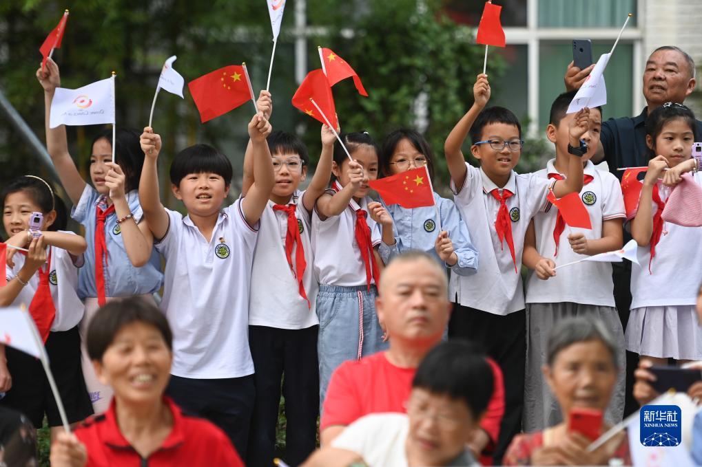 9月14日,小學(xué)生在路邊為火炬手助威。
