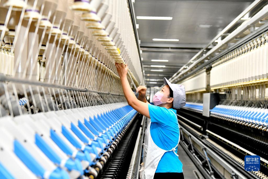 9月13日,在山東宏儒紡織科技有限公司綠色智能化生產(chǎn)車(chē)間,工作人員在加工高端紗線(xiàn)。