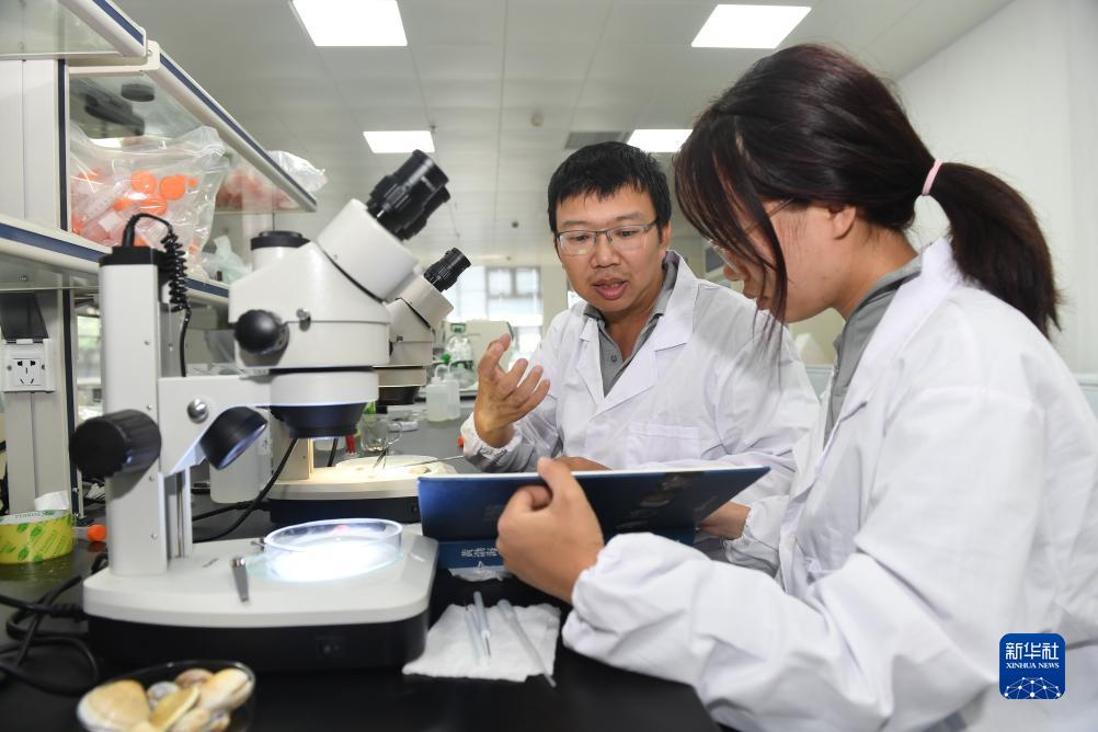 賈亦飛在東臺野外研究站實(shí)驗室教授學(xué)生底棲動(dòng)物樣品的分類(lèi)和鑒定知識(2023年8月20日攝)。新華社記者 季春鵬 攝