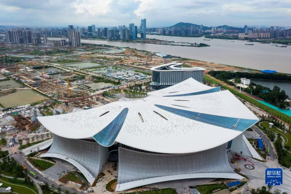 南沙國際金融論壇(IFF)永久會(huì )址屋面結構為空間桁架結構體系,以純白金屬屋面為“花瓣”,以玻璃采光屋頂為“花蕊”,共同構成一朵盛開(kāi)的木棉花(無(wú)人機照片,9月13日攝)。