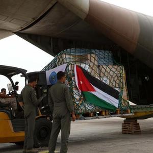 9月13日,工作人員在約旦安曼一軍用機場(chǎng)搬運援助物資。