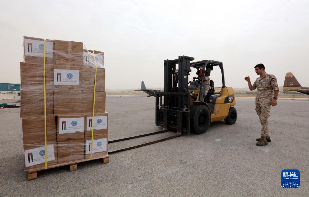 9月13日,工作人員在約旦安曼一軍用機場(chǎng)搬運援助物資。