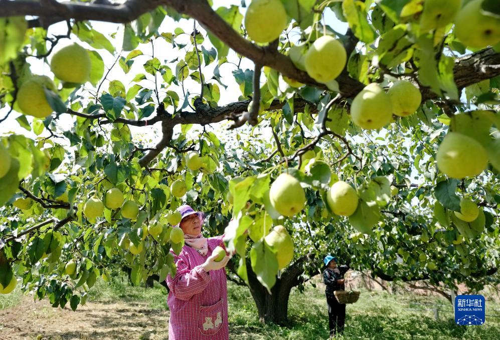 9月14日,河北省晉州市馬于鎮北辛莊村的農民在果園摘梨。