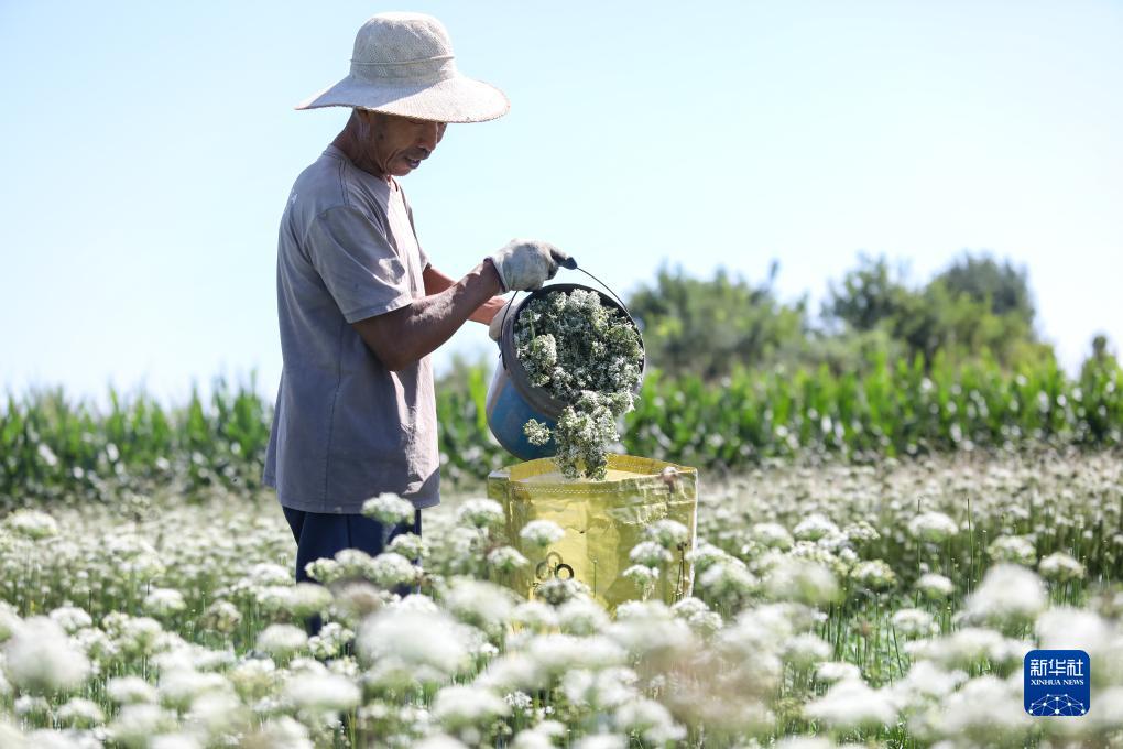 9月14日,農民在山東省淄博市高青縣青城鎮田間采摘韭花。