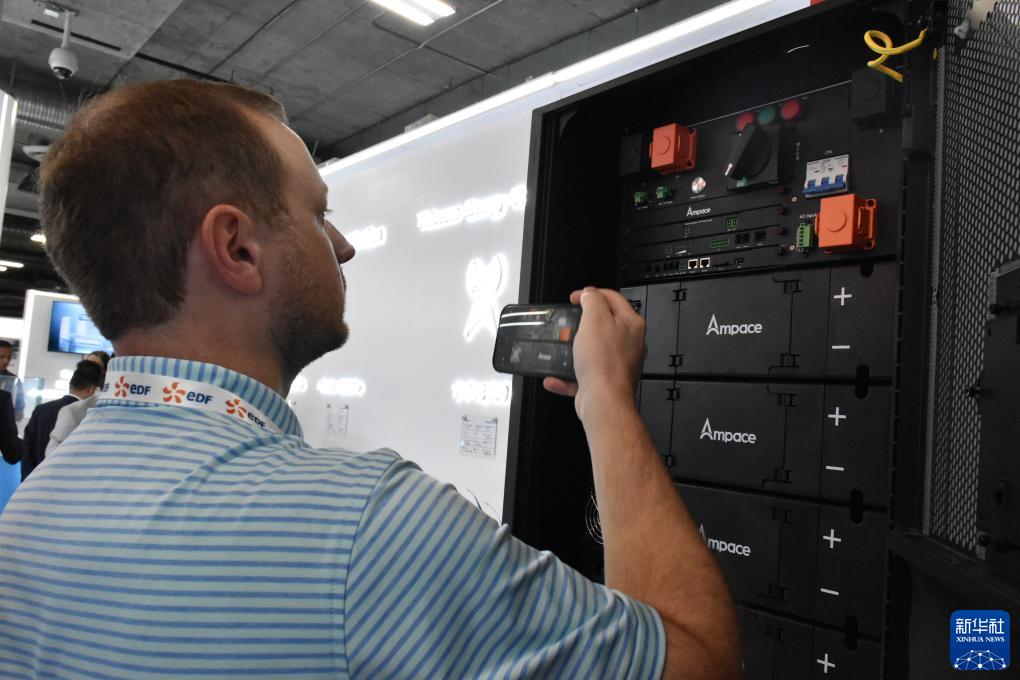 9月12日,在美國拉斯維加斯舉行的北美最大清潔能源展會(huì )RE+展會(huì )上,一名男子參觀(guān)中國企業(yè)新能安科技公司展區。