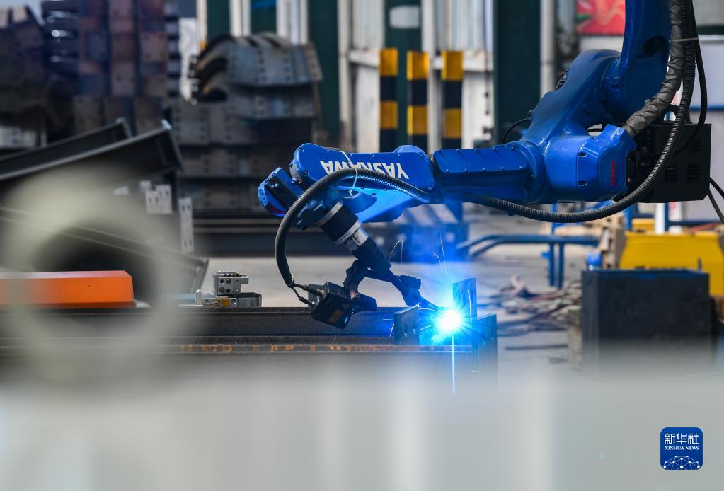 這是9月14日在渝湘高鐵重慶至黔江段站前3標智能化鋼構廠(chǎng)拍攝的型鋼拱架自動(dòng)化生產(chǎn)作業(yè)現場(chǎng)。