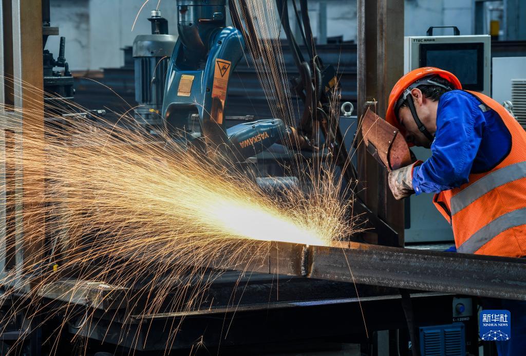 9月14日,工人在渝湘高鐵重慶至黔江段站前3標智能化鋼構廠(chǎng)作業(yè)。