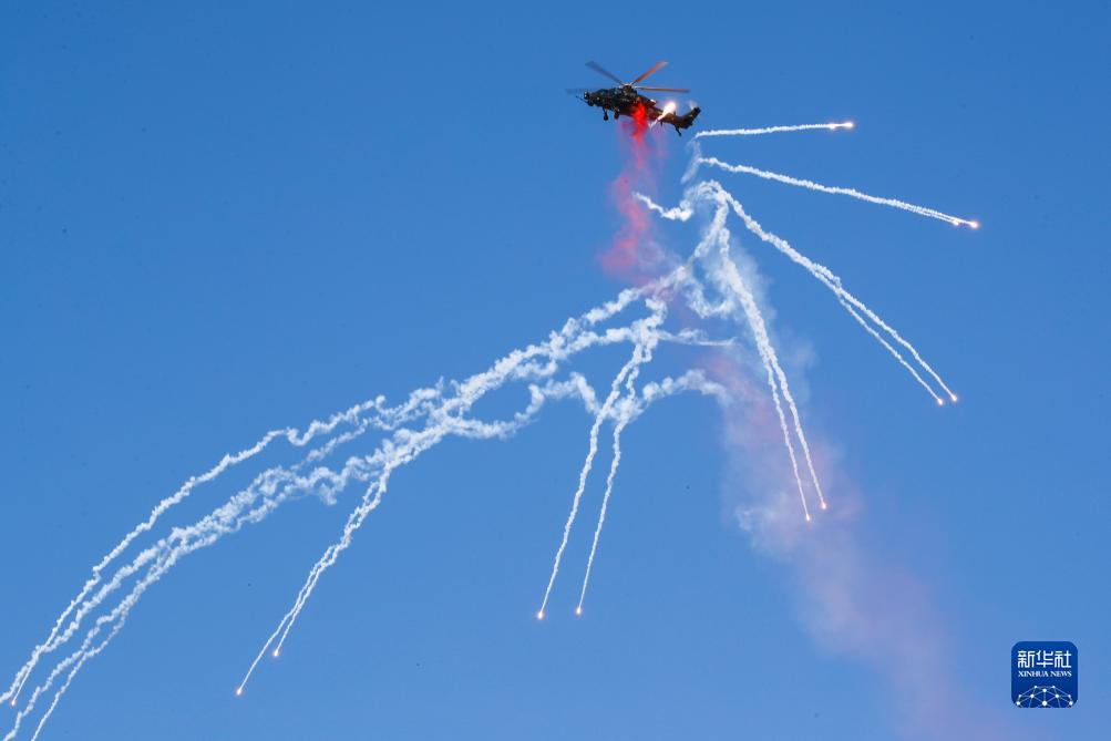 9月14日,在第六屆中國天津國際直升機博覽會(huì )開(kāi)幕式上,陸軍“風(fēng)雷”飛行表演隊直-10武裝直升機發(fā)射干擾彈。