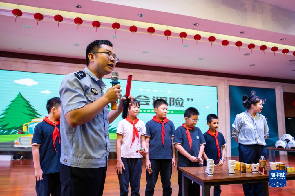 9月14日,在新世博寄宿制小學(xué),輔警為學(xué)生講解交通安全知識。