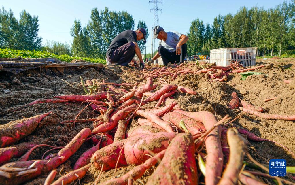 9月14日,河北省唐山市海港經(jīng)濟開(kāi)發(fā)區王灘鎮農民在田間收獲紅薯。