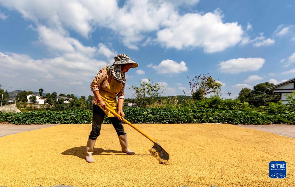 9月15日,村民在貴州省黔西市錦星鎮洪湖村晾曬稻谷。