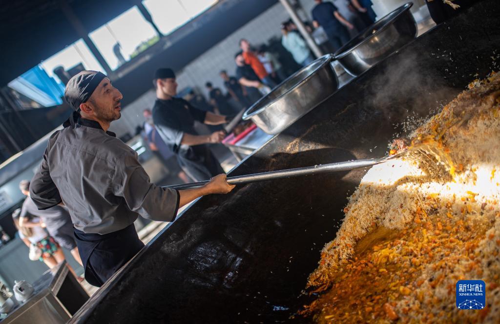 9月14日,在烏茲別克斯坦首都塔什干,中亞抓飯中心主廚制作抓飯。