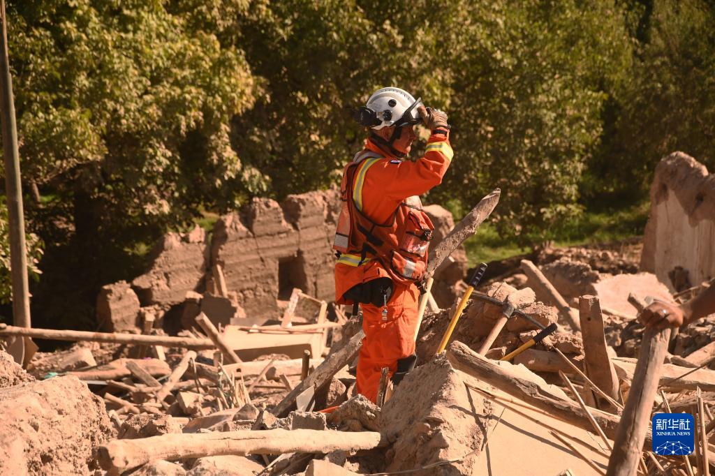 9月14日,救援人員在位于摩洛哥豪茲省的伊姆利勒村的地震廢墟上搜救。