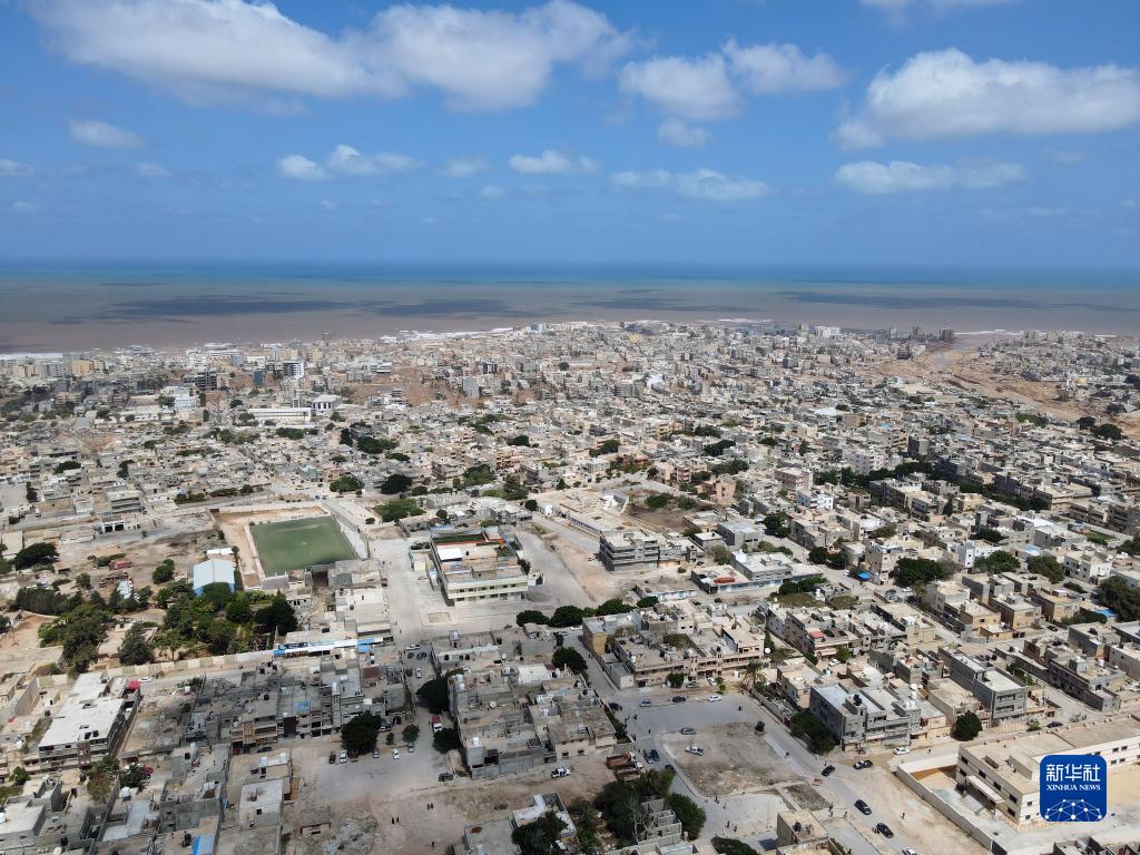 這是9月14日在利比亞?wèn)|部城市德?tīng)柤{拍攝的災后景象。