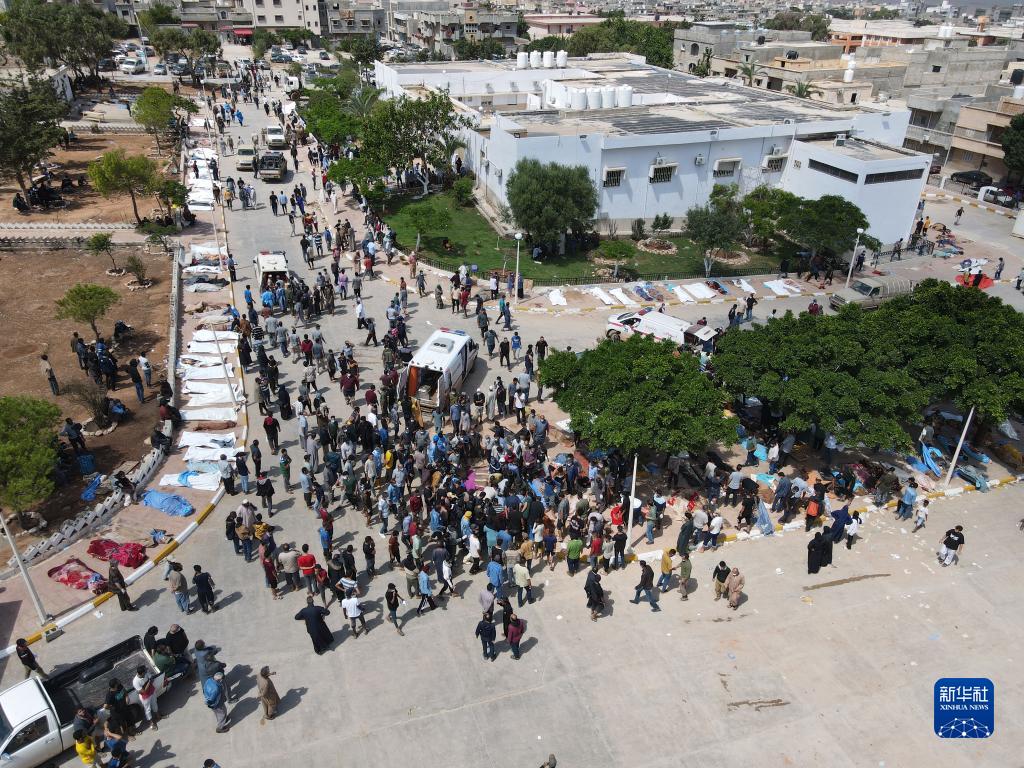 9月14日,在利比亞?wèn)|部城市德?tīng)柤{,人們聚集在遇難者遺體旁。