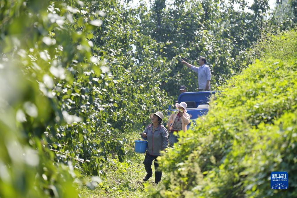 9月15日,農民在河北省玉田縣唐自頭鎮一處經(jīng)荒山開(kāi)發(fā)而建的果園內采摘鮮梨。