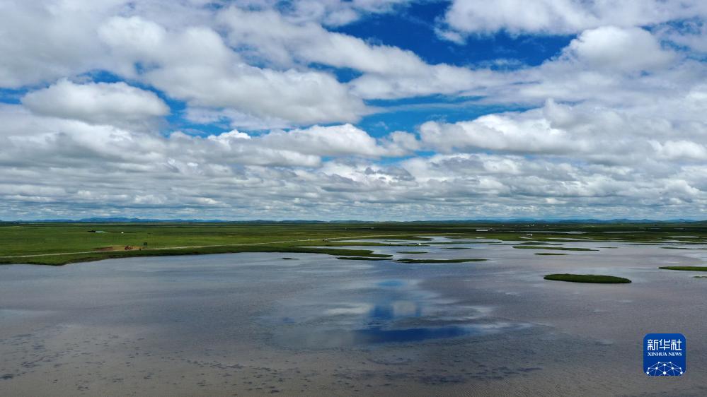 這是瑪曲縣河曲馬場(chǎng)的濕地草原景色(7月5日攝,無(wú)人機照片)。
