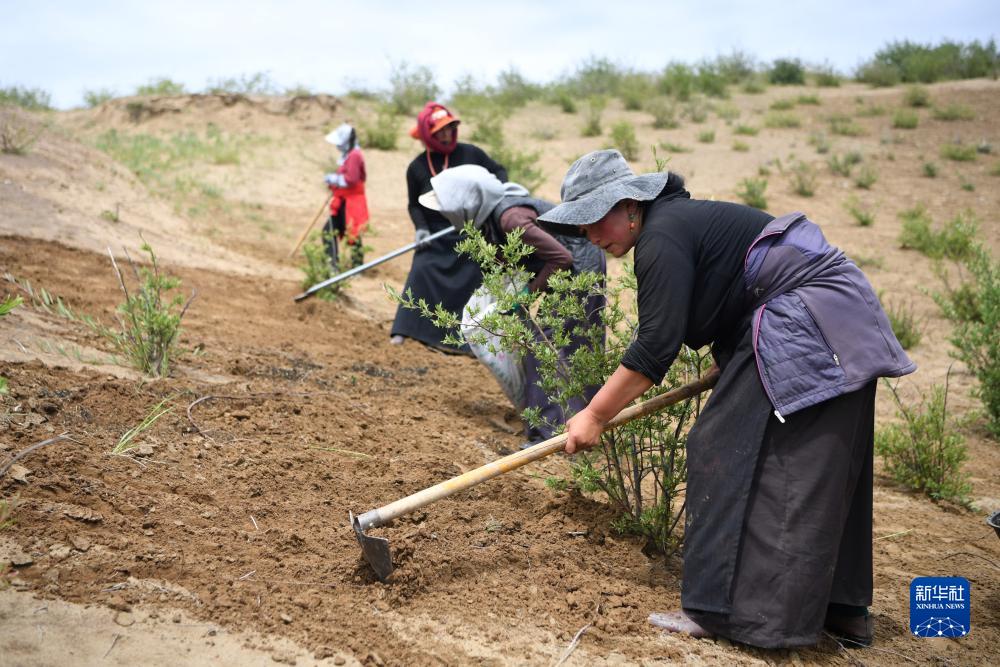 牧民在瑪曲縣歐拉鎮黃河沿岸一處沙化草原治理點(diǎn)補種草籽(7月6日攝)。
