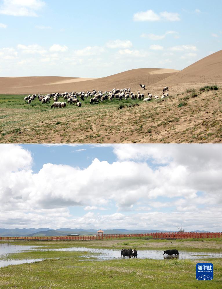 拼版照片:上圖為2004年7月19日,羊群在瑪曲縣一處沙化退化的草場(chǎng)上吃草,背后是大片流動(dòng)沙丘(新華社記者宋常青攝);下圖為2023年7月5日牦牛在瑪曲縣濕地草原上吃草(無(wú)人機照片,新華社記者陳斌攝)。