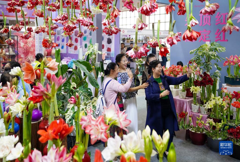 9月15日,觀(guān)眾在第二十一屆中國昆明國際花卉展一展位上自拍留念。