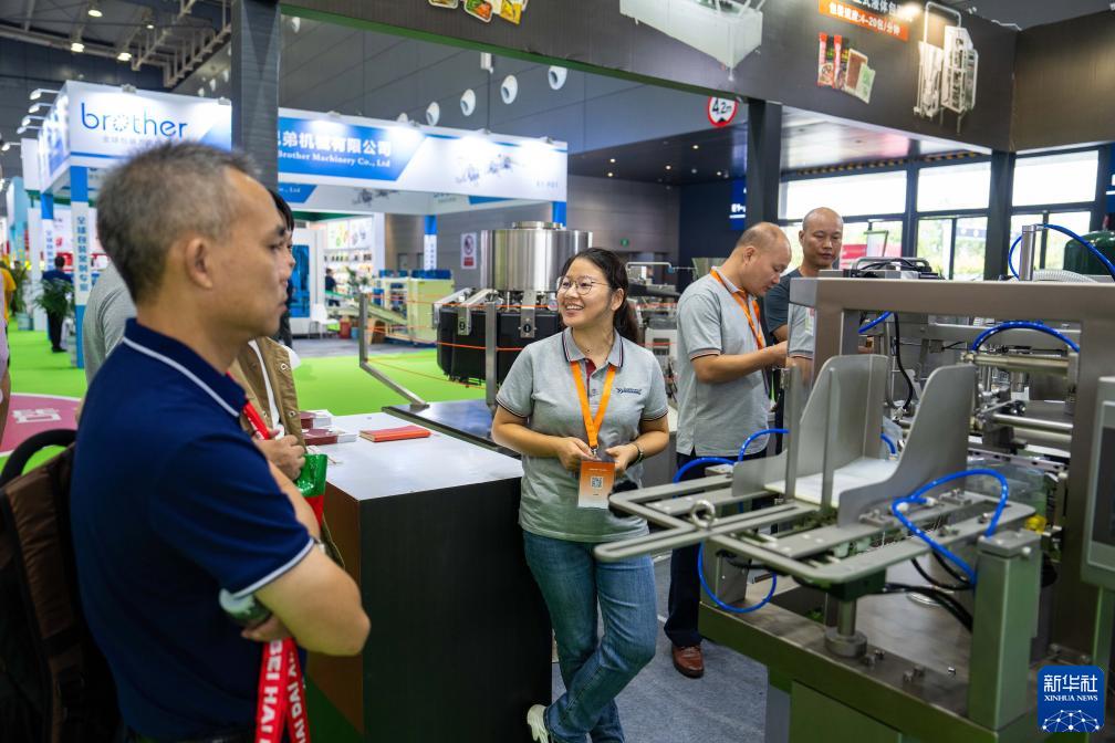 9月15日,在長(cháng)沙國際會(huì )展中心,參展商(中)向觀(guān)眾介紹食品包裝設備。