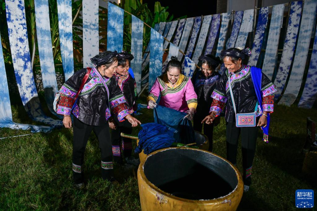 9月14日,村民在興義市萬(wàn)峰林街道的“鄉愁集市”展示染布技藝。