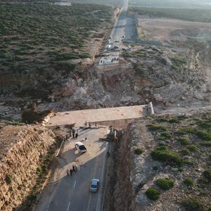 這是9月15日在利比亞?wèn)|部德?tīng)柤{附近拍攝的被毀的橋梁(航拍照片)。