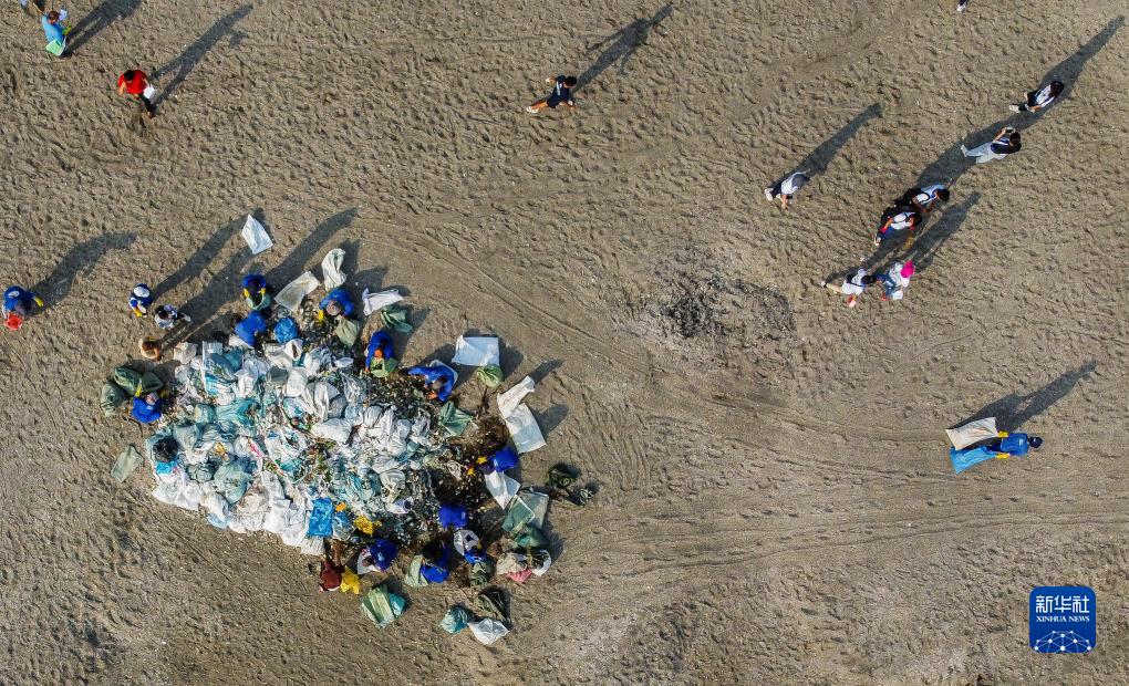 9月16日,志愿者在菲律賓馬尼拉灣舉辦的“國際海岸清理日”活動(dòng)上清理垃圾(航拍照片)。