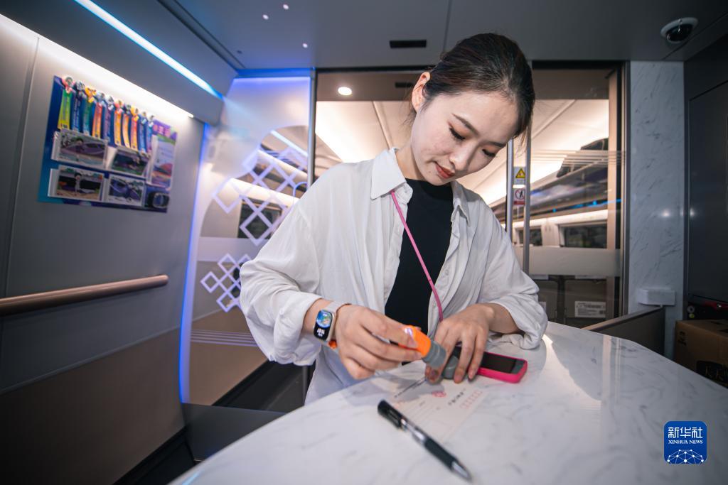 9月16日,在復興號亞運智能動(dòng)車(chē)組列車(chē)上的亞運文創(chuàng )角,一名乘客寫(xiě)明信片并蓋章留念。