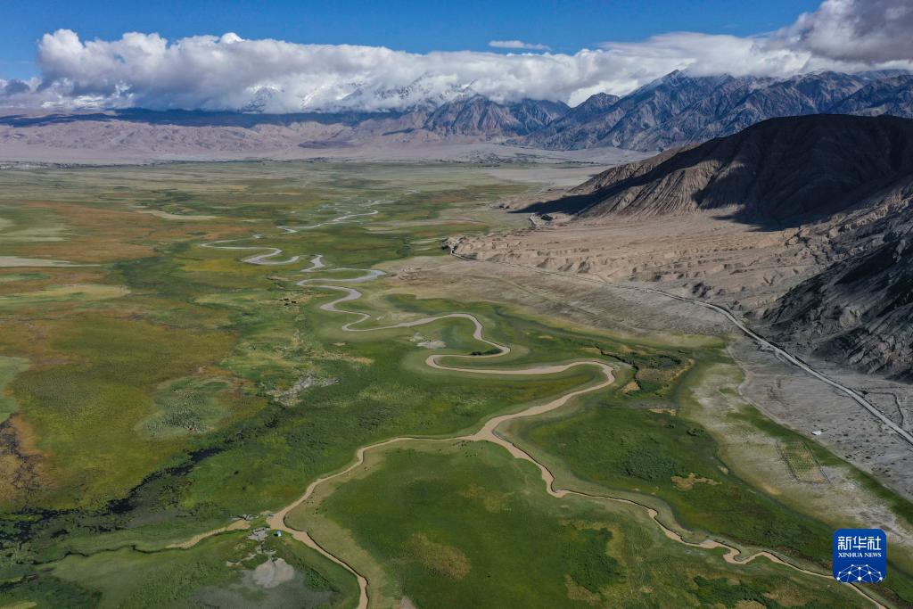 新疆塔什庫爾干塔吉克自治縣塔合曼濕地景觀(guān)(8月27日攝,無(wú)人機照片)。