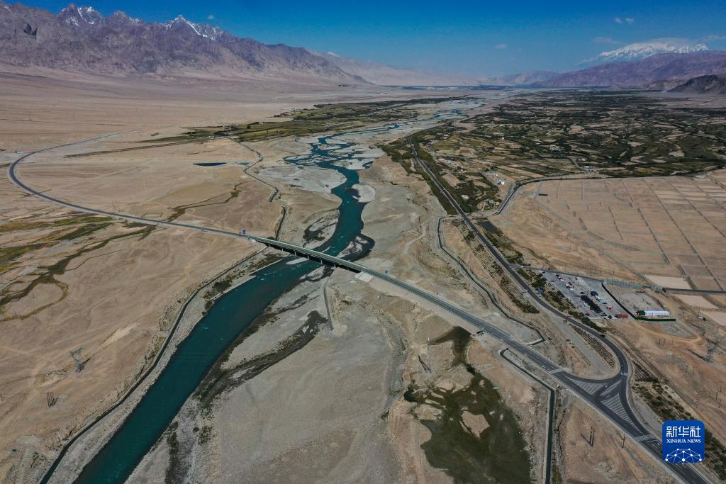 改擴建后的新314國道(畫(huà)面左側)與舊線(xiàn)路交匯于塔什庫爾干塔吉克自治縣縣城南部(8月31日攝,無(wú)人機照片)。