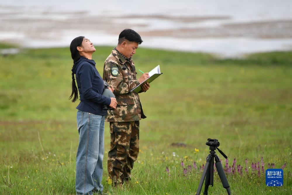 甘肅尕海則岔國家級自然保護區管護中心尕海保護站站長(cháng)香毛吉(左)和同事在巡護過(guò)程中做記錄(7月7日攝)。