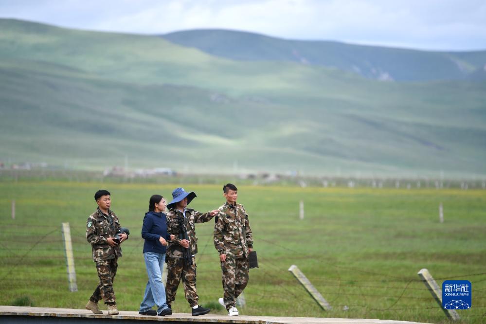 甘肅尕海則岔國家級自然保護區管護中心尕海保護站站長(cháng)香毛吉(左二)和同事在保護區內巡護(7月7日攝)。